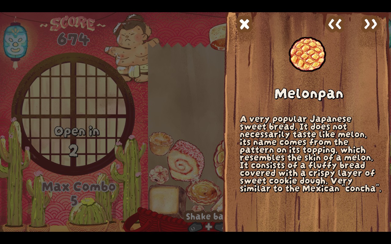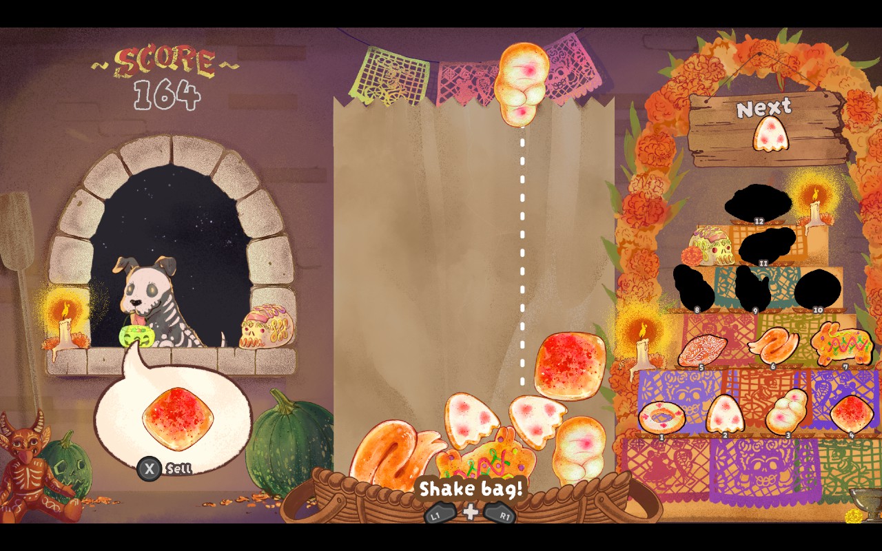There are 3 different levels as of now: La Tradicional, Día de Muertos and JapoMexa. Complexity increases slightly with each level, even if the mechanics stay the same – for example, in the JapoMexa level the shapes of the pastries make them harder to “find” each other in the bag. In fact, I’ve never managed to get the 12th pastry, even though I’ve played the game for about 10 hours so far. Each level has its own 12 pastries, thematic art and music. The main track of the game is the same but it changes a little depending on the level – for example, in the Día de Muertos one, it gets a little eerie flavor.