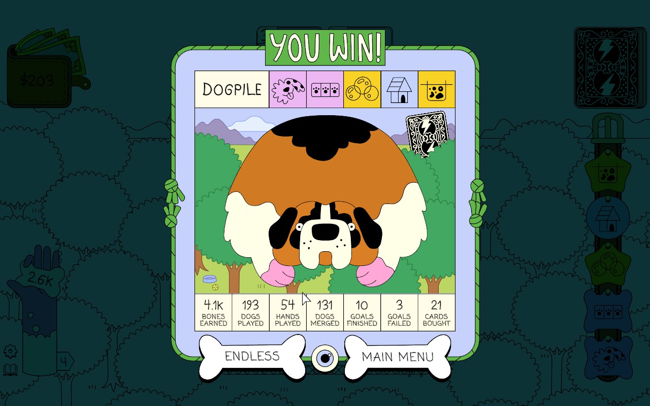 From Steam: Dogpile is a roguelike deck builder about merging cute dogs into bigger dogs. Play dogs, get money, customize your dogs with special Traits, refine your deck, PLAY MORE DOGS! DOGS!