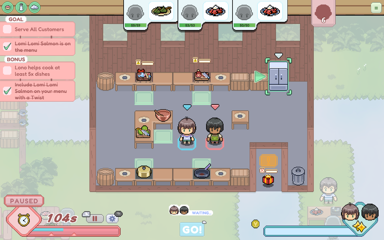 Speaking of characters, they really are what make the game. Many management games don’t put a big emphasis on story or character building, but since Kitchen Sync: Aloha! is a combination of management and RPG, it stands out by centering the mechanics around teamwork and collaborating to grow your restaurant. The closer you get to people (or the chefs get to one another), the better everyone works together.